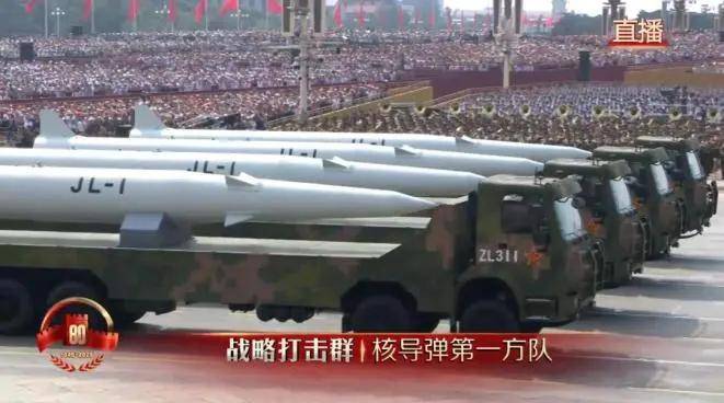 核导弹第一方队受阅的“惊雷-1”空基远程导弹、“巨浪-3”潜射洲际导弹、“东风-61”陆基洲际导弹、“东风-31”新型陆基洲际导弹,首次集中展示我军陆、海、空基“三位一体”战略核力量。